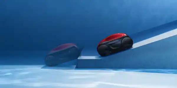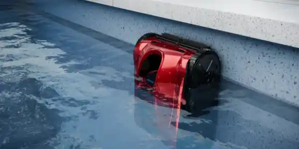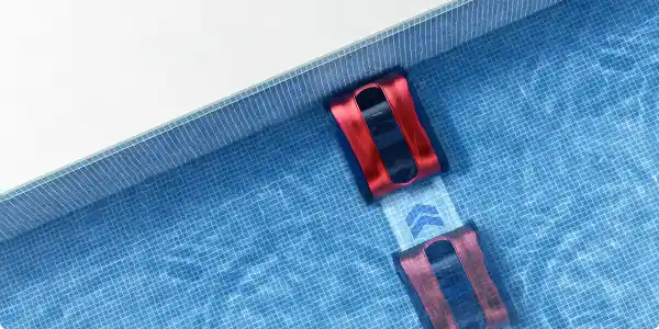 The pool cleaner travels freely in water as shallow as 35 cm, climbs two steps, and crosses drains.